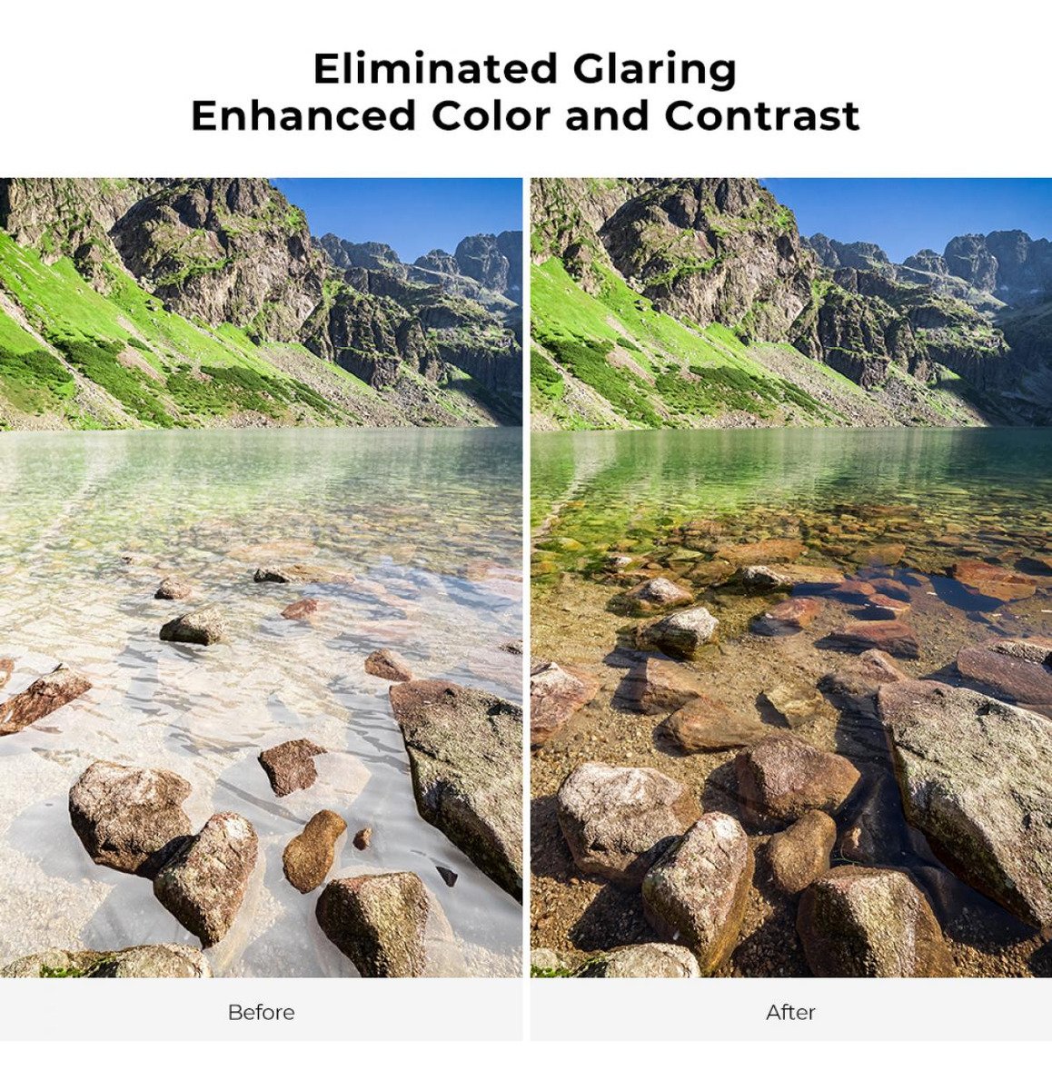 Un filtro polarizador organiza y filtra la luz polarizada direccionalmente, lo que permite la absorción de gran parte de esta luz. Esto da como resultado una reducción notable del resplandor y los reflejos de las superficies no metálicas y un aumento de la saturación de los cielos y el follaje.